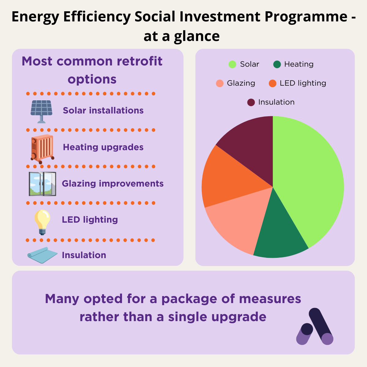 Taken together, the building mix and intervention patterns show that retrofit is rarely treated as a single upgrade decision. Organisations are often combining measures to maximise impact, both to reduce energy costs and to make better use of their space for delivery and community benefit. This reflects a practical approach where energy improvements are considered alongside how buildings support an organisation’s wider mission.